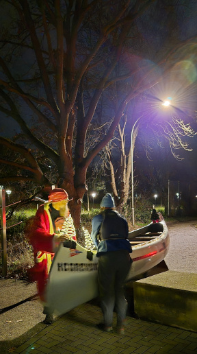Jens Reibiger, der sich eigens für die Lichterfahrt wieder in sein Weihnachtsmann-Kostüm gehüllt hatte, war auch paddel-technisch bestens ausgerüstet. Als er mit seinem Holz-Paddel den Zehner-Canadier vom Ufer abstoßen wollte, gab’s ein lautes Knacken, und sein Paddel zerbrach in zwei Teile. „Keine Sorge, es geht gleich weiter“, rief er in die Runde, und hielt ein Ersatzpaddel in die Höhe. Ganz entspannt nahm es auch Timo Klomfass. Der 27 Jahre alte Kajakfahrer machte in der Dämmerung in Höhe der Autobahnbrücke Bekanntschaft mit herunterhängenden Ästen und kenterte. Das unfreiwillige Bad in der Erft kommentierte er später mit einem Lachen: „Der Baum war eben stärker als ich.